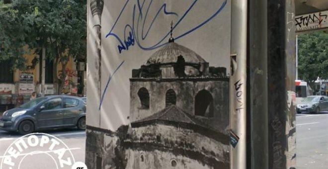 Άγνωστοι, στο κέντρο της πόλης “μουτζούρωσαν” τις φωτογραφίες και έγραψαν με σπρέι συνθήματα.