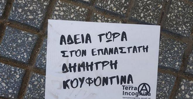 Εν συνεχεία, οι άγνωστοι πέταξαν τρικάκια με μηνύματα αλληλεγγύης για την απεργία πείνας στην οποία έχει προβεί.