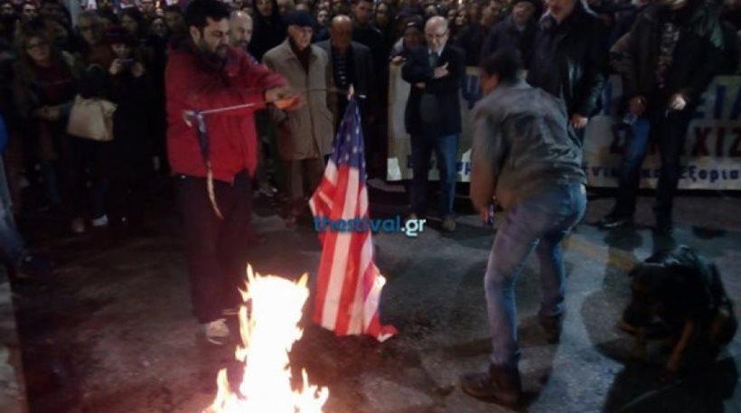 Σε συμβολικό κάψιμο της αμερικανικής σημαίας προχώρησαν οι διαδηλωτές στην πορεία που διεξάγεται στη Θεσσαλονίκη για την επέτειο των τραγικών γεγονότων της 17ης Νοεμβρίου 1973, στο Πολυτεχνείο.