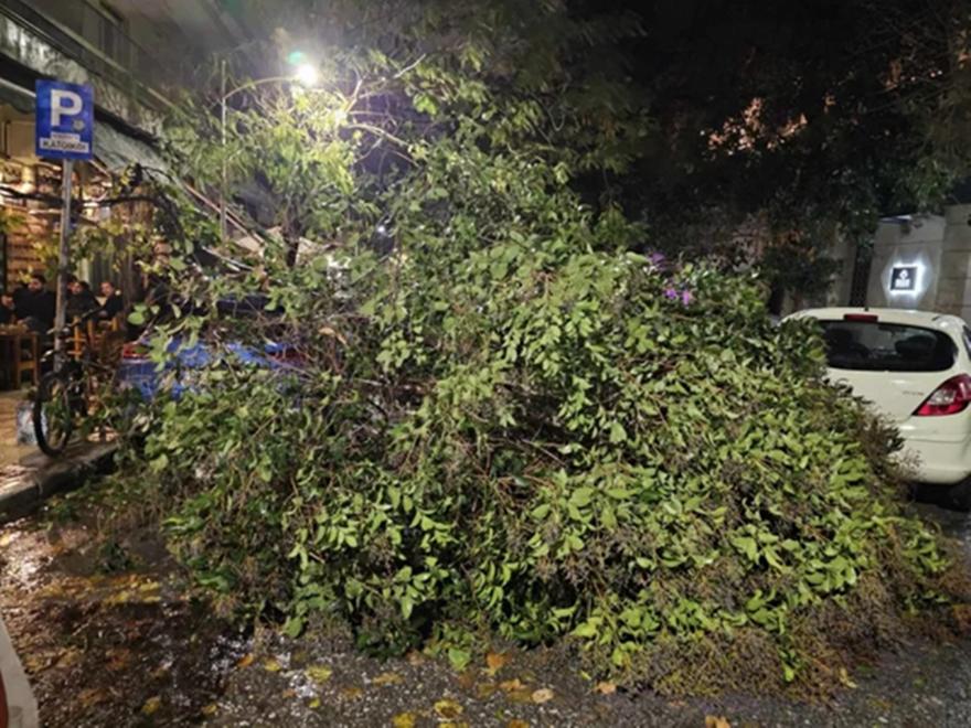 Από τις πτώσεις των δέντρων προκλήθηκαν ζημιές σε σταθμευμένα αυτοκίνητα.