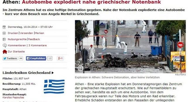 Χαρακτηριστικός είναι ο τρόπος που μετέδωσε αρχικά την είδηση η Handelsblatt. «Πριν από την επίσκεψη Μέρκελ: Παγιδευμένο αυτοκίνητο εξερράγη κοντά στην ελληνική κεντρική τράπεζα».