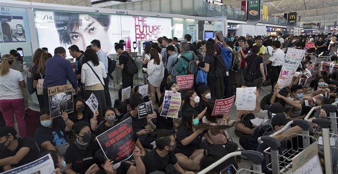 Η αερολιμενική αρχή ματαίωσε χθες, Δευτέρα, όλες τις πτήσεις προς και από το αεροδρόμιο και ο αερομεταφορέας του Χονγκ Κονγκ, η Cathay Pacific Airways, ανακοίνωσε σήμερα πως ανέστειλε όλα τα check-in.
