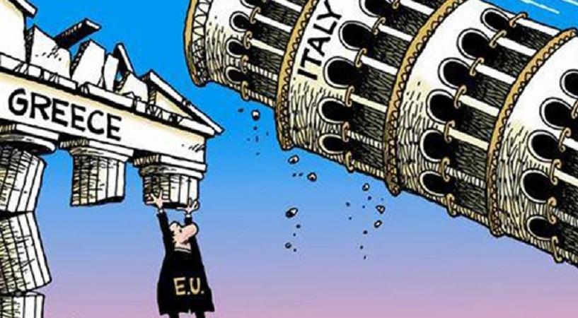 Στο σκίτσο, απεικονίζεται ο πύργος της Πίζας να πέφτει πάνω στον ετοιμόρροπο Παρθενώνα, ενώ ένας κοινοτικός αξιωματούχος κάνει ό,τι μπορεί για να στηρίξει το μισογκρεμισμένο οικοδόμημα αναλαμβάνοντας ρόλο… κίονα.