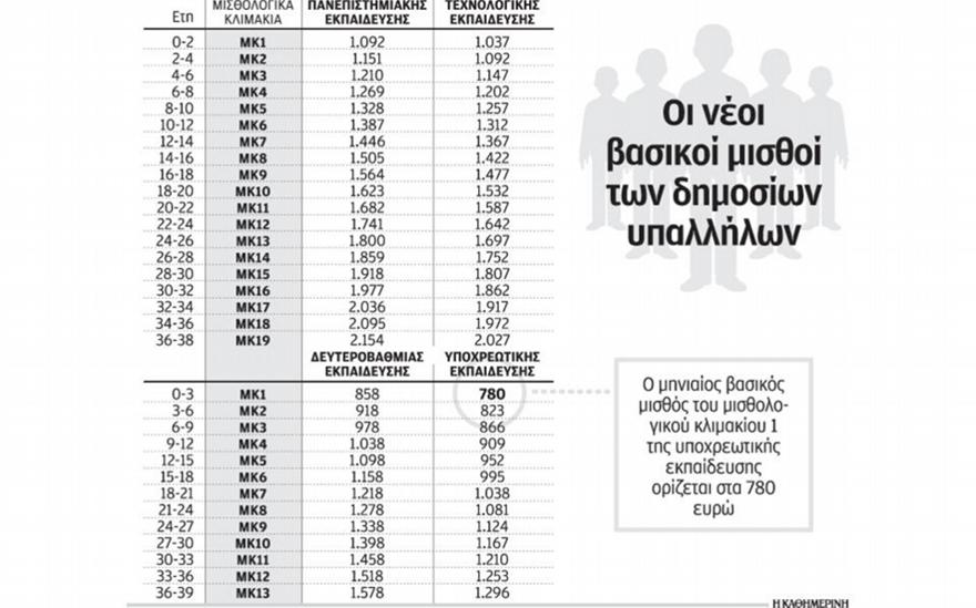 Από 780 ευρώ (βασικός μισθός υπαλλήλου υποχρεωτικής εκπαίδευσης) έως 4.631 ευρώ μηνιαίως (μισθός γ.γ. υπουργείου) κυμαίνονται οι απολαβές που προβλέπονται στο νέο μισθολόγιο για τους δημοσίους υπαλλήλους.
