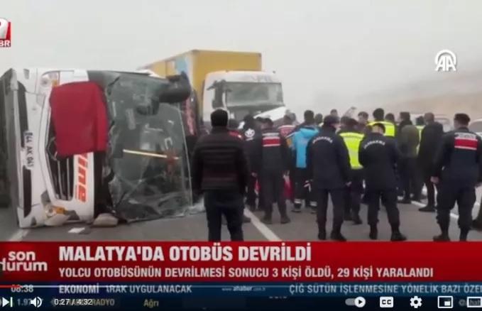 Σύμφωνα με το CNNTurk, νωρίς σήμερα το πρωί επιβατικό λεωφορείο στη Μαλάτεια, που κινούνταν σε αυτοκινητρόδρομο, χτυπήθηκε από πίσω από φορτηγό που ταξίδευε προς την ίδια κατεύθυνση και ανατράπηκε.