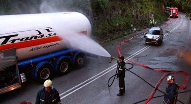 Βυτιοφόρο διανομής υγραερίου, έχασε τον έλεγχο λόγω της ολισθηρότητας του οδοστρώματος στην Εθνική Οδό Ιωαννίνων -Άρτας, με αποτέλεσμα να συγκρουστεί αρχικά με ένα αυτοκίνητο και στη συνέχεια να πέσει πάνω σε βράχια, σήμερα το πρωί.