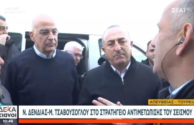 Είμαι πολύ χαρούμενος που υποδέχτηκα τον Νίκο Δένδια («I am very happy to have him here»), δήλωσε ο Τούρκος υπουργός Εξωτερικών Μεβλούτ Τσαβούσογλου στον ανταποκριτή του ΣΚΑΪ στην Τουρκία, Μανώλη Κωστίδη, κατά την άφιξή του μαζί με τον Έλληνα υπουργό Εξωτερικών στο κέντρο πολιτικής προστασίας στην Αντιόχεια.