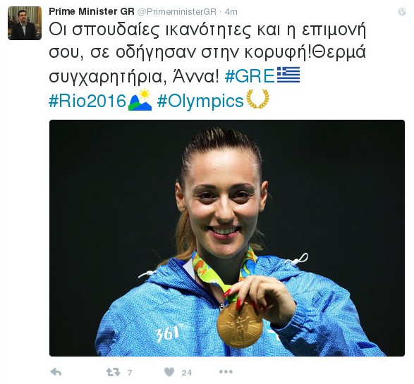 Τα συγχαρητήρια του μέσω του Twitter απέστειλε στη χρυσή Ολυμπιονίκη Άννα Κορακάκη, ο Πρωθυπουργός, Αλέξης Τσίπρας.