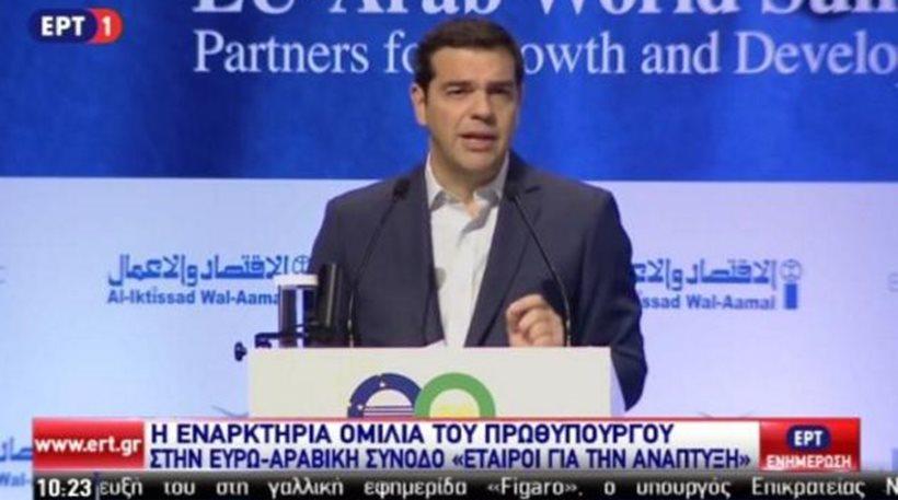 «Η σημερινή διάσκεψη, σε μια κρίσιμη στιγμή για την ελληνική οικονομία, σε μια στιγμή ανάκαμψης, αλλά και σε μια κρίσιμη στιγμή για τη σταθερότητα στην ευρύτερη περιοχή, μπορεί να συνεισφέρει πάρα πολλά» τόνισε ο Αλέξης Τσίπρας, ανοίγοντας με την ομιλία του τις εργασίες της Ευρωαραβικής Συνόδου «Εταίροι για την Ανάπτυξη», που πραγματοποιείται στο Μέγαρο Μουσικής Αθηνών.