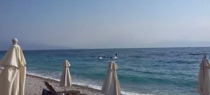 Νωρίς το πρωί, εμφανίστηκαν στα ρηχά, αρκετά έξω στην παραλία δύο πανέμορφα δελφίνια, τα οποία άρχισαν τα παιχνίδια τους, τρελαίνοντας τους παραθεριστές που απολάμβαναν εκείνη την ώρα το μπάνιο τους.