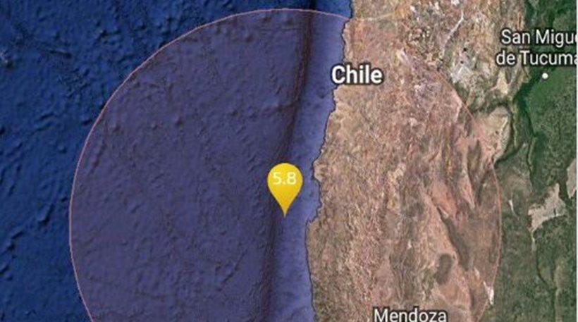 Σεισμός μεγέθους 5,9 βαθμών της κλίμακας Ρίχτερ σημειώθηκε ανοικτά των ακτών της Χιλής, 102 χλμ. δυτικά-νοτιοδυτικά της πόλης Κοκίμπο, σε βάθος 10 χλμ., ανακοίνωσε το Γεωδυναμικό Ινστιτούτο των ΗΠΑ.