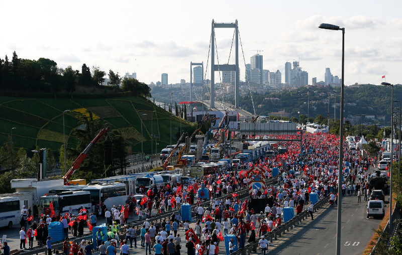 Στην Κωνσταντινούπολη, δεκάδες χιλιάδες άνθρωποι, στην πλειονότητά τους υποστηρικτές του προέδρου της χώρας Ρετζέπ Ταγίπ Ερντογάν, κατέκλυσαν τους δρόμους, κρατώντας τουρκικές σημαίες αλλά και φωτογραφίες των θυμάτων του αποτυχημένου πραξικοπήματος, και κατευθύνθηκαν προς τη γέφυρα του Βοσπόρου, εκεί που πριν από έναν χρόνο εκτυλίχθηκαν συγκλονιστικές σκηνές τη νύχτα της 15ης Ιουλίου.