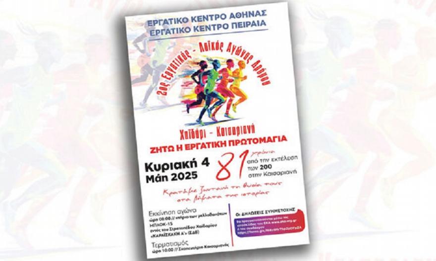 Για δεύτερη συνεχόμενη χρονιά τα Εργατικά Κέντρα Αθήνας και Πειραιά διοργανώνουν εργατικό-λαϊκό αγώνα δρόμου στο πλαίσιο των εκδηλώσεων της Εργατικής Πρωτομαγιάς, τιμώντας τους 200 εκτελεσθέντες στην Καισαριανή.