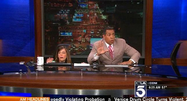 Στο κανάλι KTLA, το ζευγάρι των παρουσιαστών – Ο Κρις Σόιμπλε και η Μέγκαν Χέντερσον, κρύφτηκαν κάτω από τα γραφεία τους.