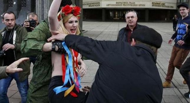 Δύο γυμνόστηθες ακριβίστριες από την οργάνωση Femen, ξεπήδησαν ξαφνικά μέσα από το πλήθος και άρχισαν να φωνάζουν συνθήματα κατά του Πούτιν, μπροστά στο κοινοβούλιο της Κριμαίας, στη Συμφερόπολη.