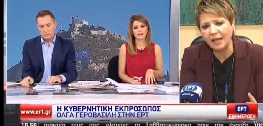 «Χέρι» στη δημοσιογράφο της ΕΡΤ που... τόλμησε να υπενθυμίσει την απόφαση του Συμβουλίου της Επικρατείας για την ακύρωση των αποφάσεων Σκουρλέτη σχετικά με τα μεταλλεία χρυσούς στις Σκουριές έβαλε η Όλγα Γεροβασίλη το πρωί της Πέμπτης.
