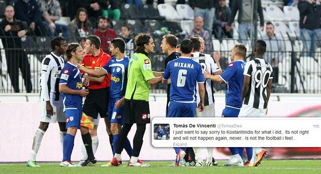 Συγγνώμη από τον Δημήτρη Κωνσταντινίδη για το χτύπημα στο 57ο λεπτό της χθεσινής αναμέτρησης του ΠΑΟΚ με τον ΠΑΣ Γιάννινα ζήτησε ο Τόμας Ντε Βινσέντι, μέσω της προσωπικής του σελίδας στο Twitter.