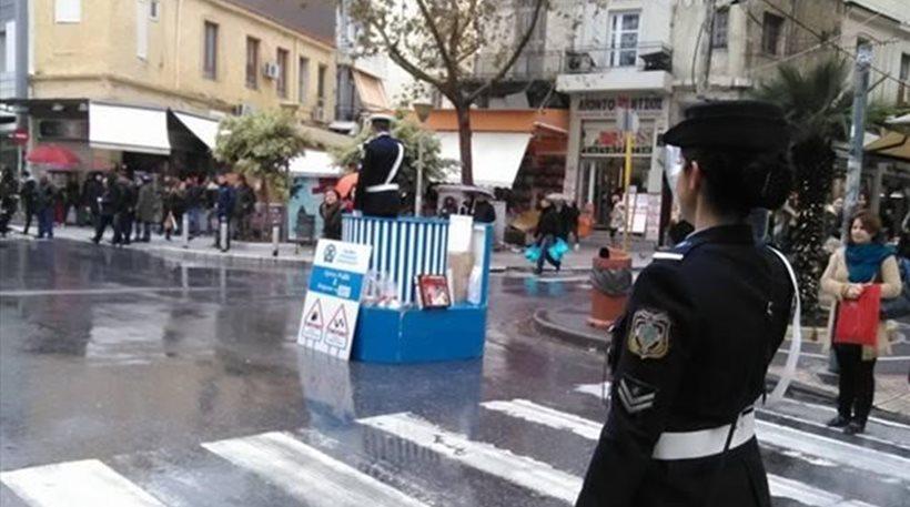 Παρά το τσουχτερό κρύο και τη συνεχή βροχή στον «σταυρό» της πόλης, στη συμβολή της Λεωφόρου Δικαιοσύνης με την οδό 1821 και την «25ης Αυγούστου», στήθηκε η «βαρέλα», όπου στο παρελθόν ο γαντοφορεμένος τροχονόμος ρύθμιζε σε καθημερινή βάση την κυκλοφορία των λιγοστών οχημάτων.