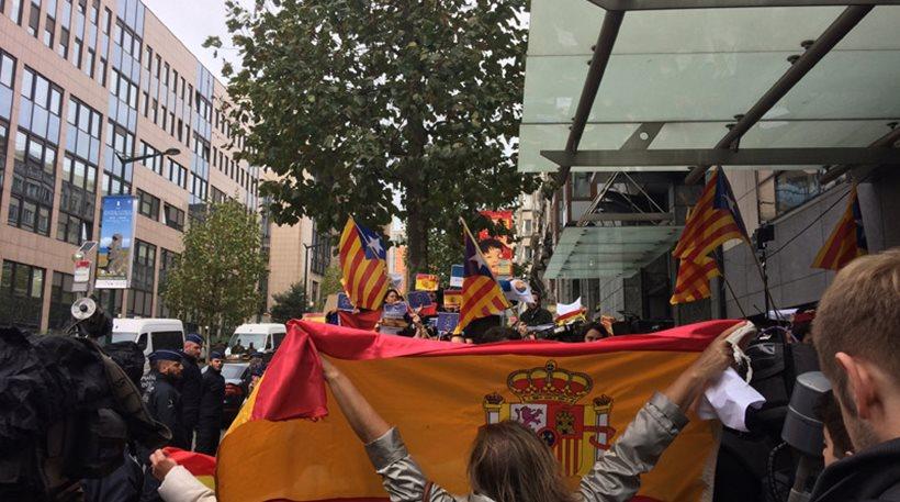 Ανάμικτες Καταλανικές και Ισπανικές σημαίες μαζί με συνθήματα των υποστηρικτών της κάθε πλευράς, δείχνουν το ρήγμα που δημιουργείται στην Ισπανική κοινωνία, ακόμα και στις Βρυξέλλες.