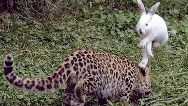 Αν περίμεναν να δουν τις εντυπωσιακές κυνηγητικές επιδόσεις που έχουν τα αιλουροειδή στην ανάπτυξή τους, μάλλον θα απογοητεύτηκαν καθώς τα μικρά προσέγγισαν μάλλον με περιέργεια αλλά και φόβο τον λαγό ενώ εκείνος χοροπηδούσε εδώ κι εκεί αποφεύγοντάς τα.