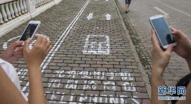 «Πρώτος πεζόδρομος κινητών τηλεφώνων στην Κίνα», με οδηγίες του πώς να χρησιμοποιούνται οι λωρίδες.