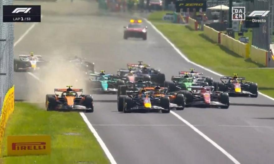 Με τον Μαξ Φερστάπεν να εκκινεί από την pole position και τον Λάντο Νόρις δίπλα του στη δεύτερη θέση, ο Ολλανδός πιλότος της Red Bull συνέκλινε προς την πλευρά του Βρετανού αμέσως μετά τα «πράσινα φώτα» με αποτέλεσμα να τον στείλει στα χορτάρια!