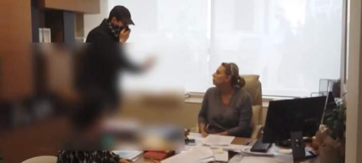 Με καλυμμένα τα πρόσωπά τους, τα μέλη του Ρουβίκωνα εισβάλλουν στο γραφείο συμβολαιογράφου στα Εξάρχεια και ξεκινούν τις καταστροφές και τις απειλές.