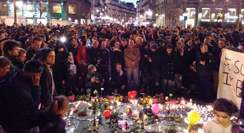 This is the scene now at the #Bourse, Brussels city centre as hundreds gather in tribute to #brusselsattack victims pic.twitter.com/WlDLxegVbO
