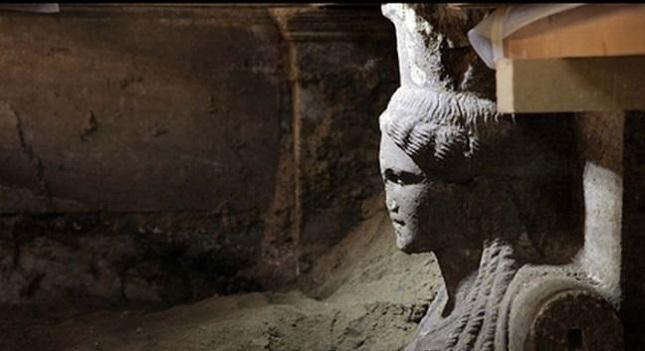 Όπως επίσημα ανακοινώθηκε από το υπουργείο Πολιτισμού με την αφαίρεση των αμμωδών χωμάτων, στο χώρο μπροστά από τον δεύτερο διαφραγματικό τοίχο, αποκαλύφθηκαν κάτω από το μαρμάρινο επιστύλιο, ανάμεσα στις, επίσης, μαρμάρινες παραστάδες, δύο εξαιρετικής τέχνης καρυάτιδες , από θασίτικο μάρμαρο συμφυείς με πεσσό, διατομής 0,20Χ0,60 μ.