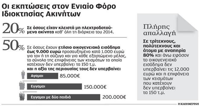 • Εκπτωση 20% στον ΕΝΦΙΑ των κενών και μη ηλεκτροδοτούμενων ακινήτων εφόσον αυτά παρέμειναν για όλο το 2015 κενά και μη ηλεκτροδοτούμενα.