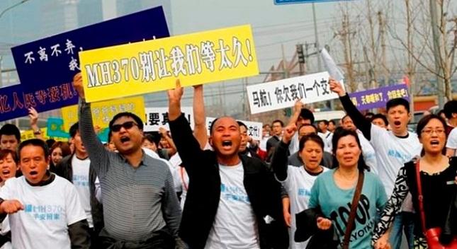 Δεκάδες μέλη των οικογενειών των Κινέζων επιβατών φώναζαν «Η μαλαισιανή κυβέρνηση μας εξαπάτησε» και «Μαλαισία φέρε πίσω τους συγγενείς μας» την ώρα που πραγματοποιούσαν ειρηνική πορεία προς την πρεσβεία.