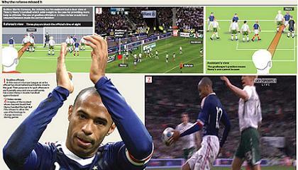 Γραφικές αναπαραστάσεις που παρουσιάστηκαν από αρκετές σουηδικές εφημερίδες, έδειξαν ότι ο Μάρτιν Χάνσον, διαιτητής του αγώνα της εθνικής Γαλλίας, με την αντίστοιχη της Ιρλανδίας και ο ένας από τους δύο βοηθούς του, δεν ήταν σε θέση να διακρίνουν από τη θέση που βρίσκονταν πως ο Τιερί Ανρί χρησιμοποίησε το χέρι προτού «σερβίρει» το γκολ της ισοφάρισης στον Γκαλάς.