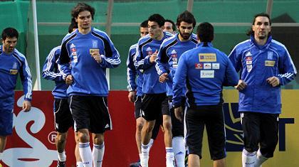 Με χειροκρότημα, όπως είθισται σε κάθε «νεοσύλλεκτο», υποδέχτηκαν τους Παντελή Καπετάνο, Γιάννη Μανιάτη και Στέλιο Μαλεζά οι «παλιοί» της Εθνικής. Οι περισσότεροι ποδοσφαιριστές έκαναν αποθεραπεία, αφού είχαν υποχρεώσεις με τις ομάδες τους την Κυριακή, ενώ κάποιοι πιο ξεκούραστοι έπαιξαν έξι εναντίον έξι σε μικρό χώρο. Στη μία εξάδα ήταν οι Τζόρβας, Μάκος, Μαλεζάς, Χριστοδουλόπουλος, Σαμαράς, Γκέκας και στην άλλη οι Χαλκιάς, Κυργιάκος, Σπυρόπουλος, Καραγκούνης, Κατσουράνης, Χαριστέας.