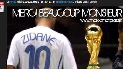 Ο αμυντικός της Ίντερ απάντησε μέσω της προσωπικής του ιστοσελίδας, όπου αναγράφεται «Χωρίς Λόγια» πάνω από μία φωτογραφία του «Ζιζού» να περνά μπροστά από το τρόπαιο του Μουντιάλ μετά την αποβολή του για το χτύπημα στον Ιταλό αμυντικό. «Ευχαριστώ πολύ κύριε», είναι η-η γραμμένη στα γαλλικά-λεζάντα της φωτογραφίας.
