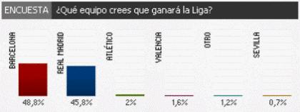 Σε αυτή περίπου μισοί χρήστες του ίντερνετ που συμμετείχαν προέβλεψαν ότι η ομάδα του Πεπ Γκουαρντιόλα θα κατακτήσει και πάλι το πρωτάθλημα. Συγκεκριμένα, το 48.8% του συνόλου τάχθηκαν στο πλευρό των «Καταλανών».