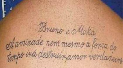 «Μπρούνο και Μάκα. Η φιλία που ούτε η δύναμη του χρόνου θα την καταστρέψει, αληθινή αγάπη», αναγράφεται στην πλάτη του Μακαράο (φωτό). Ο φίλος του πρώην τερματοφύλακα της Φλαμένγκο «χτύπησε» το συγκεκριμένο τατού, όταν άρχισαν οι έρευνες για τη δολοφονία της 25χρονης γυναίκας.