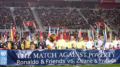 Ενώπιον 48.783 θεατών και εκατομμυρίων τηλεθεατών ανά την υφήλιο, οι μεγαλύτεροι σύγχρονοι ποδοσφαιρικοί αστέρες έστειλαν το βράδυ της Πέμπτης το δικό τους μήνυμα. Για τρίτη συνεχή χρονιά, ο Ζινεντίν Ζιντάν και ο Ρονάλντο, συμπαίκτες στη Ρεάλ Μαδρίτης, έγιναν για ένα 90λεπτο αντίπαλοι, στον αγώνα κατά της φτώχειας που διεξήχθη στο Ντίσελντορφ της Γερμανίας. Μεταξύ αυτών και ένας Έλληνας, ο Ζήσης Βρύζας, που αγωνίστηκε με τους «φίλους» του Ζιντάν, ενώ στην ομάδα των «φίλων» του Ρονάλντο αγωνίστηκε ο Ριβάλντο. Οι πρώτοι επιβλήθηκαν με 4-2, αλλά αυτό είναι το λιγότερο που μετρά σε αυτό τον αγώνα. Αλγεινές εντυπώσεις προκάλεσε το γεγονός πως παρά το ότι ο αγώνας διεξαγόταν στη Γερμανία, απουσίαζαν οι Κέβιν Κουράνι και Λούκας Ποντόλσκι, με το αιτιολογικό πως ο Γιούργκεν Κλίνσαμ είχε ζητήσει από όλους τους διεθνείς να ξεκουραστούν. Τα τέρματα των νικητών σημείωσαν οι Μπερμπάτοφ, Ποσερ και Τριστάν (2) ενώ για τους επιλέκτους του Ρονάλντο σκόραραν οι Κοκού και Αμπουταρικα. Τα εσοδα, που τα δύο προηγούμενα χρόνια άγγιξαν το ένα εκατομμύριο ευρώ, θα διατεθούν ια φιλανθρωπίες σε χώρες της Ασίας, Αφρικής και Ν.Αμερικής.