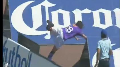 Σαν να μην έφτανε αυτό έριξε και μια κουτουλιά πέφτοντας σε μία άλλη πινακίδα που …παραμόνευε από πίσω, με αποτέλεσμα να τελειώσει άδοξα το ματς για εκείνον.