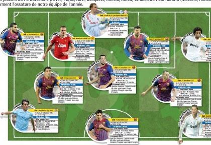 Έξι ποδοσφαιριστές της Μπαρτσελόνα έχουν πάρει θέσεις στην καλύτερη ενδεκάδα για το 2011, σύμφωνα με την γαλλική εφημερίδα «Equipe».