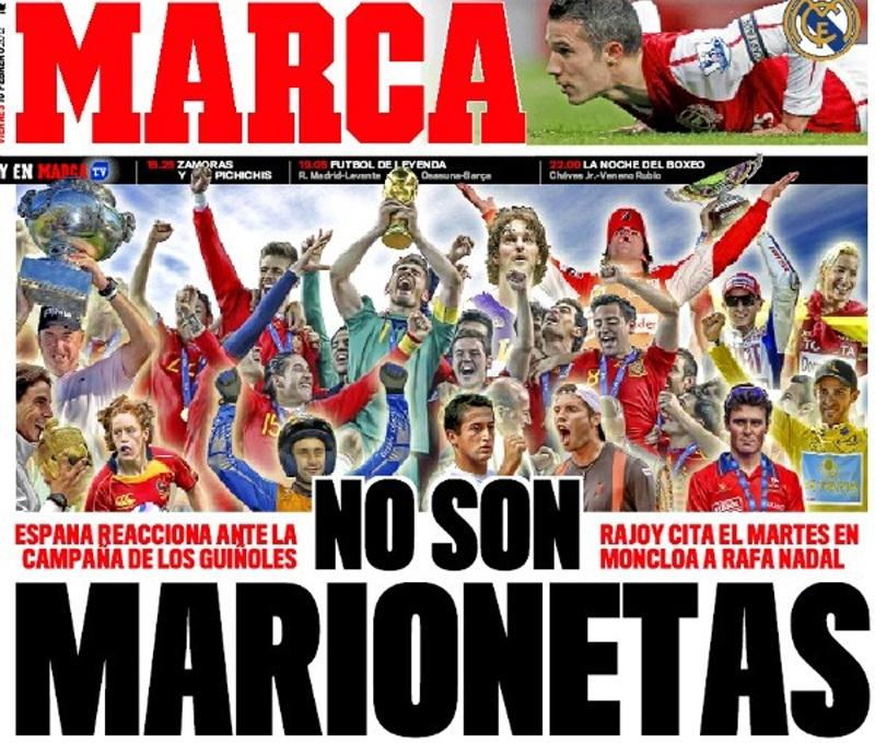 «Δεν είναι μαριονέτες», είναι ο κεντρικός τίτλος της Marca και συνεχίζει: «Η Ισπανία αντιδρά στην υπόθεση με τις μαριονέτες»!