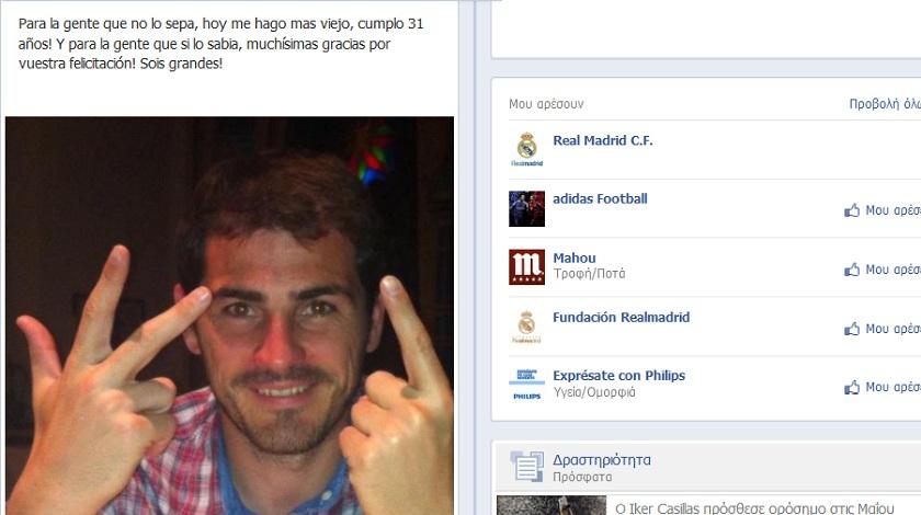Το τριακοστό πρώτο έτος της ηλικίας του κλείνει σήμερα ο Ίκερ Κασίγιας, ο οποίος θέλησε – μέσω του Facebook - να ευχαριστήσει όλους τους θαυμαστές του για τις ευχές τους. Πριν από λίγες μέρες ο Ισπανός τερματοφύλακας κατέκτησε το πέμπτο του πρωτάθλημα με τη φανέλα της Ρεάλ Μαδρίτης, όμως από το 19ο έτος της ηλικίας του έχει πανηγυρίσει πολλούς τίτλους με αποκορύφωμα την κατάκτηση του Μουντιάλ στη Νότιο Αφρική το 2010.