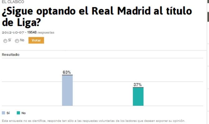 Μπορεί ακόμα η Ρεάλ Μαδρίτης να κατακτήσει τον τίτλο στην Primera Division, όπως προκύπτει από τα αποτελέσματα δημοσκόπησης που έχει διενεργηθεί στην ισπανική ιστοσελίδα «AS.com».