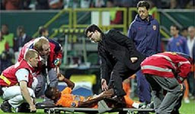 Ισχυρό πλήγμα αποτελεί για τη Μπαρτσελόνα ο τραυματισμός του Σαμουέλ Ετό στην αναμέτρηση με τη Βέρντερ στη Βρέμη (1-1) για τη δεύτερη αγωνιστική των ομίλων του Champions League. Σύμφωνα με τις πρώτες ιατρικές εκτιμήσεις ο Καμερουνέζος επιθετικός υπέστη ρήξη έξω μηνίσκου στο δεξί του γόνατο, κάτι που αν επαληθευτεί από τις ιατρικές εξετάσεις σημαίνει πως ο πρώτος σκόρερ των «μπλαουγκράνα» θα μείνει εκτός αγωνιστικών χώρων για δύο με τρεις μήνες! «Δεν έχουν πειραχτεί οι σύνδεσμοι», διαβεβαίωσε ο γιατρός της Μπαρτσελόνα, Ρίκαρντ Προύνα, ενώ προσέθεσε πως ο παίκτης θα υποβληθεί σε περαιτέρω εξετάσεις με την επιστροφή της αποστολής της ομάδας στη Βαρκελώνη, ενώ πιθανότατα θα χρειαστεί να υποβληθεί σε εγχείρηση.