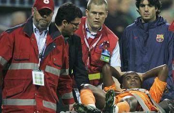 Ο Σαμουέλ Ετό τραυματίστηκε στο 65ο λεπτό της αναμέτρησης σε μια ανύποπτη φάση, όταν προσπάθησε να αλλάξει κατεύθυνση και το πόδι του «κόλλησε» στο χορτάρι. Ο άτυχος 25χρονος επιθετικός μετρούσε ήδη τέσσερα γκολ σε ισάριθμες αγωνιστικές στο ισπανικό πρωτάθλημα και ένα γκολ στο Champions League.