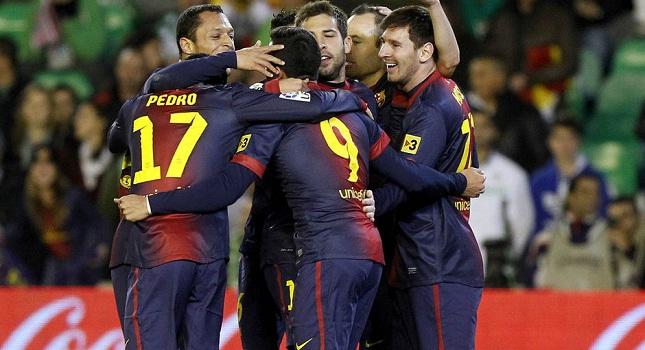 Με εντυπωσιακό τρόπο έκανε… ποδαρικό στο 2013 η Μπαρτσελόνα, συντρίβοντας με σκορ 4-0 την Εσπανιόλ, στο ντέρμπι της Καταλονίας για τη 18η αγωνιστική της Primera Division. Μόλις 29 λεπτά χρειάστηκαν οι παίκτες του Τίτο Βιλανόβα, ο οποίος επέστρεψε στον πάγκο ύστερα από το πρόβλημα υγείας που τον ταλαιπώρησε πρόσφατα, για να «καθαρίσουν» το ματς, με τα γκολ των Τσάβι (10’), Πέδρο (15’, 27’) και Μέσι (πεν. 29’).