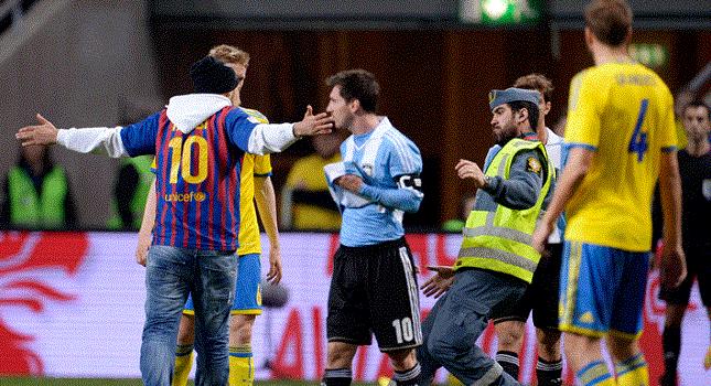 Συνήθεια έχει κάνει ένας οπαδός στη Σουηδία τα «ντου» στους αγωνιστικούς χώρους για να εκφράσει το θαυμασμό του στους αγαπημένους του ποδοσφαιριστές. Η προχθεσινή εισβολή του για να αγκαλιάσει και να φιλήσει τον Λιονέλ Μέσι στο φιλικό της Σουηδίας με την Αργεντινή δεν ήταν η πρώτη του φορά. Το 2006, όταν η Βραζιλία είχε αντιμετωπίσει τον Ισημερινό στη Στοκχόλμη, είχε κάνει κάτι αντίστοιχο με στόχο τον Ροναλντίνιο.