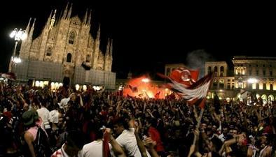 Πάρτι μέχρι τις πρώτες πρωινές ώρες στήθηκε στο Μιλάνο για την κατάκτηση του Champions League από τη Μίλαν. Χιλιάδες οπαδοί των «ροσονέρι» ξεχύθηκαν στους δρόμους της πόλης πεζοί ή με τα αυτοκίνητά τους μετατρέποντας τη νύχτα σε μέρα με τα βεγγαλικά και τα τραγούδια τους. Το επίκεντρο του γλεντιού ήταν η «Piazza de Duomo», η οποία βάχτηκε «μελανόλευκη» από τους «τιφόζι» των νέων πρωταθλητών Ευρώπης. Τα παρατράγουδα δεν έλειψαν, αφού κάποιοι προξένησαν ζημιές σε καταστήματα, υπήρξαν κάποιοι μικροτραυματισμοί φιλάθλων, που μεταφέρθηκαν με ασθενοφόρο στο νοσοκομείο, ενώ χρειάστηκε η επέμβαση και της πυροσβαστικής για να σβήσουν κάποιες μικρές φωτιές που άναψαν οι πιο θερμόαιμοι.