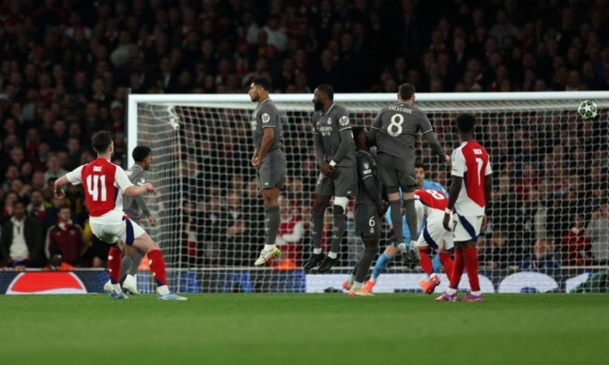 Με δύο απευθείας εκτελέσεις φάουλ του Ράις και ένα γκολ του Μερίνο η Άρσεναλ κέρασε τρία γκολ τη Ρεάλ Μαδρίτης (3-0) στον πρώτο μεταξύ τους προημιτελικό και βρίσκεται με το ένα πόδι στα ημιτελικά του Champions League.
