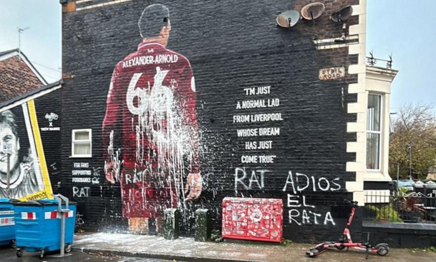 Το πρώτο φως της ημέρας αποκάλυψε τον βανδαλισμό που υπέστη ένα εντυπωσιακό γκράφιτι που είχε δημιουργηθεί σε τοίχο κοντά στο «Άνφιλντ» με τη μορφή του Άγγλου μπακ. Οι άγνωστοι πέταξαν λευκή μπογιά στη μορφή του Αλεξάντερ-Άρνολντ και πρόσθεσαν στα ισπανικά «Adios, el rata», κάτι που μεταφράζεται ως «αντίο, προδότη» (σ.σ. κυριολεκτικά τον αποκαλούν… αρουραίο). Υπάλληλοι του δήμου φρόντισαν να αποκαταστήσουν άμεσα τη ζημιά.