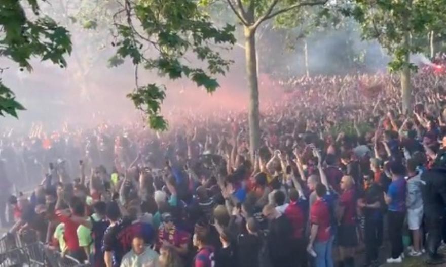 Χιλιάδες φίλαθλοι των Καταλανών έχουν μαζευτεί στους δρόμους γύρω από την έδρα της Μπαρτσελόνα, δημιουργώντας εντυπωσιακή ατμόσφαιρα και περιμένοντας να υποδεχθούν την αποστολή της αγαπημένης τους ομάδας, με συνθήματα και καπνογόνα!